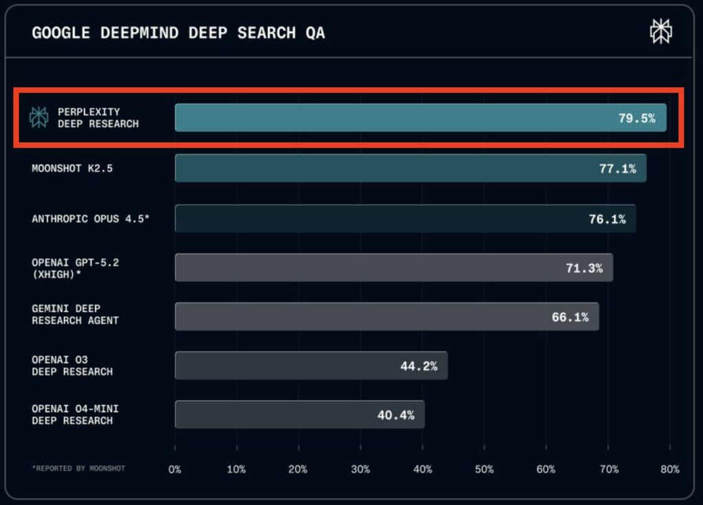 Op de Google DeepMind Deep Search QA-leaderboard scoort Perplexity 79.5%, boven Moonshot K2.5 (77.1%), Anthropic Opus 4.5 (76.1%) en OpenAI GPT-5.2 (71.3%) – precies zoals in de bijgevoegde grafiek.