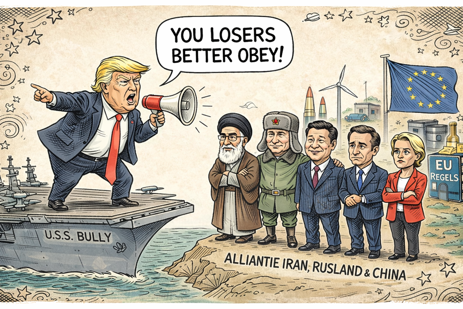 De VS dwingen Europa tot vazalpositie in empire restoration, met dreigementen om zonder hen door te gaan; Europa volgt in sancties tegen Rusland en China, leidend tot energiecrises en industriële schade. Pragmatische handel ontbreekt door gebrek aan moed.