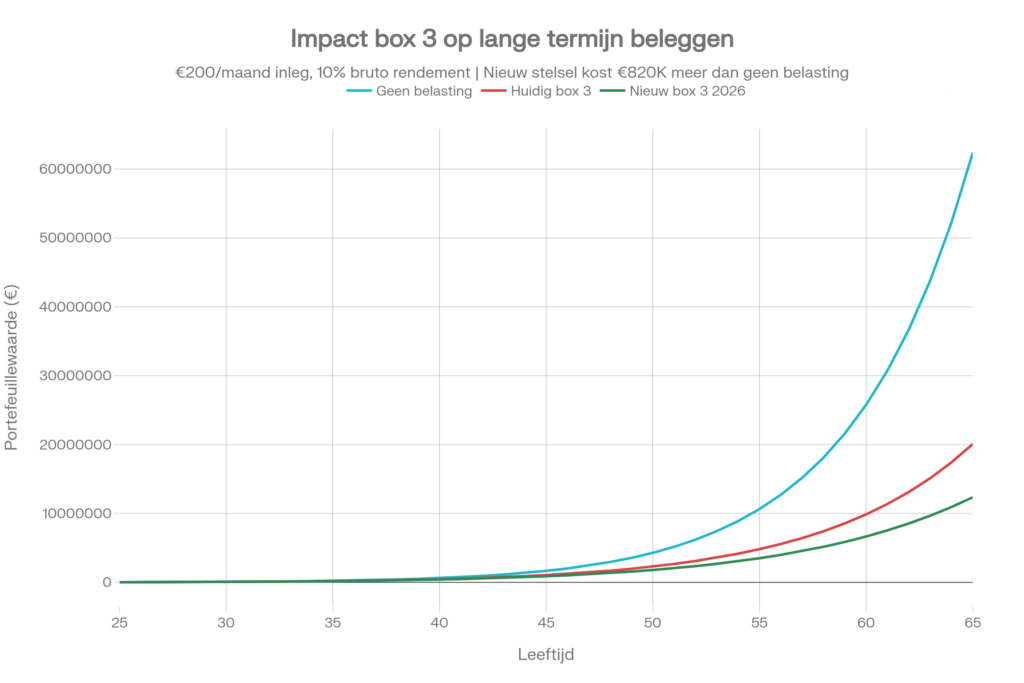 De grafiek toont aan dat het nieuwe box 3-stelsel van 2026 een belegger op leeftijd 65 ruim €820.000 minder oplevert dan de situatie zonder belasting. De huidige systematiek kost al circa €684.000 ten opzichte van belastingvrij beleggen, maar het nieuwe forfaitaire rendement van 7,78% maakt dit effect nog zwaarder. Dit illustreert het compounding-effect: belasting die jaarlijks het vermogen aantast, snijdt exponentieel in het eindvermogen – niet lineair.